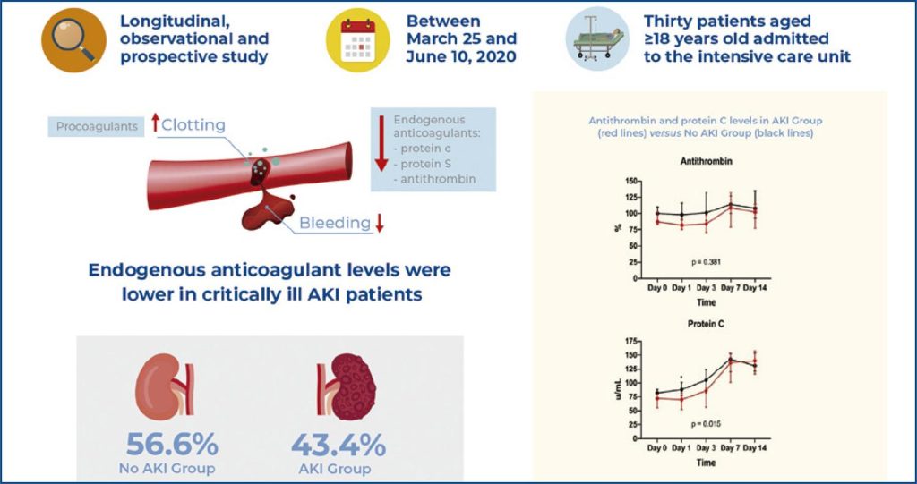 Serum levels of antithrombin activity and protein C were lower in patients who developed acute kidney injury.