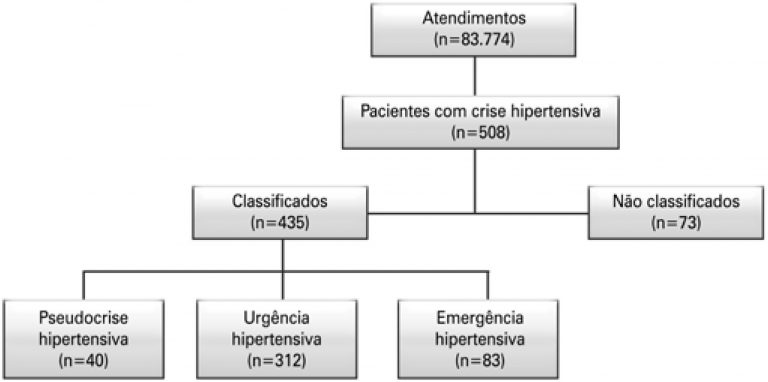 Foram avaliados 508 pacientes (57% mulheres; 56,3±13,8 anos) com crise hipertensiva (pressão diastólica de 120mmHg), idade maior ou igual a 18 anos, atendidos em um serviço de emergência de um hospital geral público. A crise hipertensiva foi classificada em urgência, emergência ou pseudocrise.