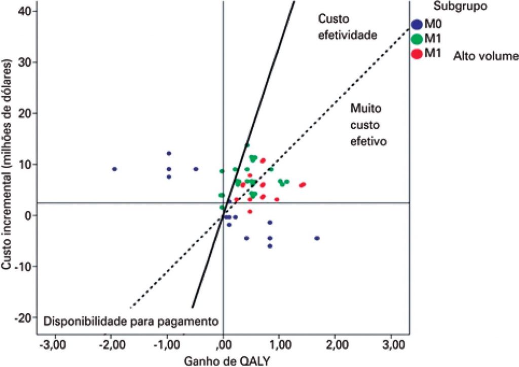 A adição de quimioterapia levou a um ganho de anos de vida ajustados por qualidade para todos os doentes. Este incremento foi seis vezes maior para os pacientes com doença metastática de alto volume. Nestes pacientes, as taxas do custo incremental por anos de vida ajustados por qualidade foram até 74% mais baixos do que o aumento das taxas dos pacientes com doença não metastática.