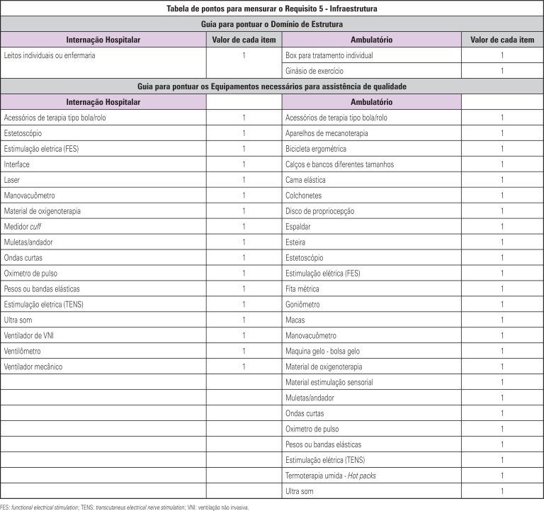 Cinco requisitos constituíram o índice de qualidade de assistência da Fisioterapia, após a aplicação da ferramenta denominada Matriz de Causa e Efeito. Os requisitos foram avaliação individual do desempenho do fisioterapeuta, indicador de resultado de assistência, avaliação da adesão da Fisioterapia nos protocolos, medir se o prognóstico e resultado de tratamento foi alcançado, e infraestrutura.