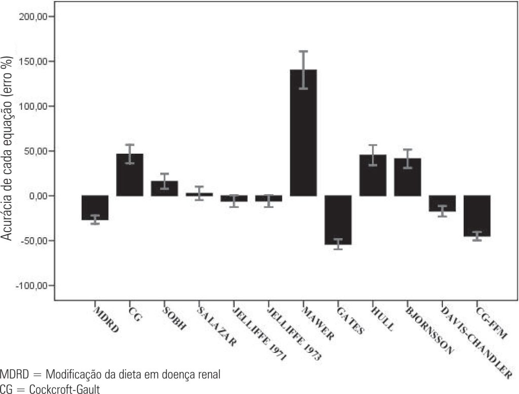 A fórmula de Cockcroft-Gault e a equação de modificação da dieta em doença renal são imprecisas em pacientes gravemente obesos (precisão de 40,9 e 33,4, respectivamente). A equação de Sobh não apresentou viés no grupo geral e em dois subgrupos. As equações de Salazar-Corcoran e Sobh não apresentaram viés em todo o grupo (viés: −5,2, intervalo de confiança (IC) 95% = −11,4, 1,0 e 6,2; IC95% = −0,3, 12.7, respectivamente). Todas as outras equações foram imprecisas no grupo como um todo.