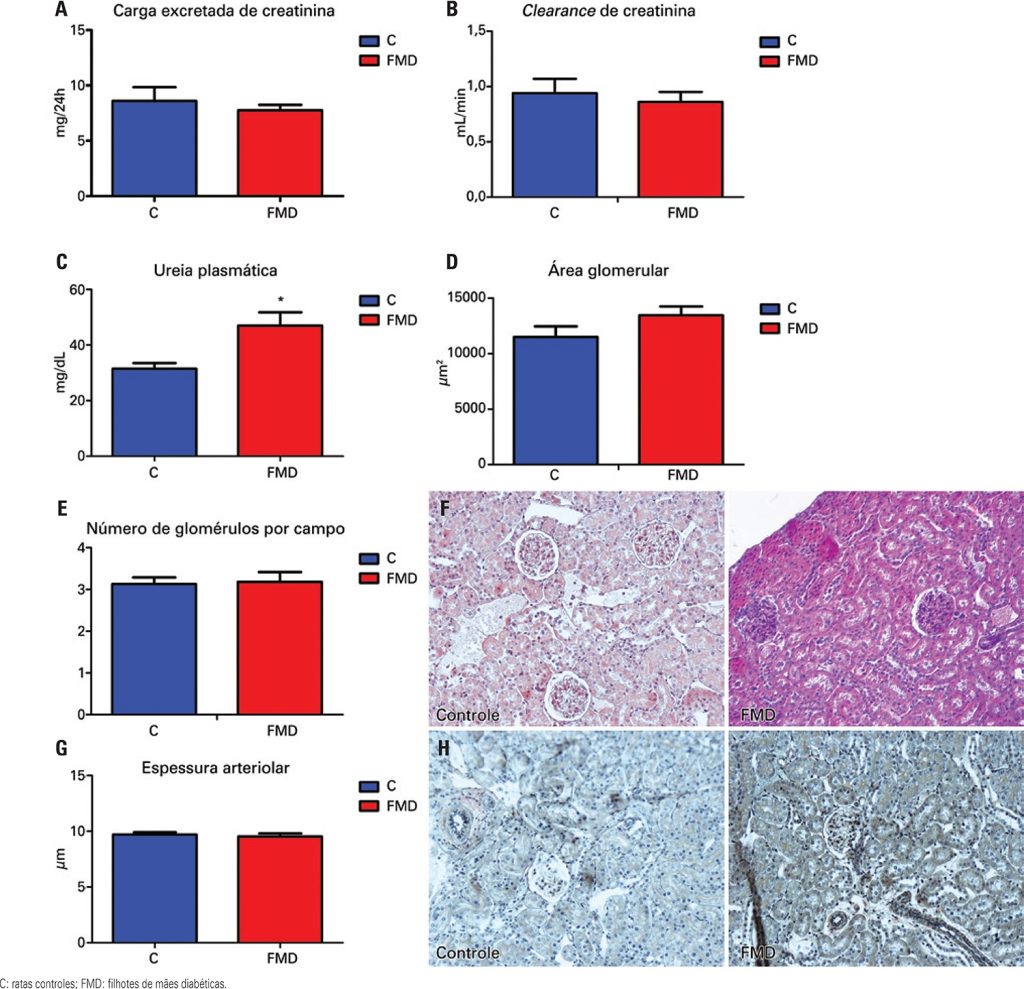As fêmeas da prole de mães diabéticas apresentaram elevação da pressão arterial e redução do ritmo de filtração glomerular em relação ao grupo controle.