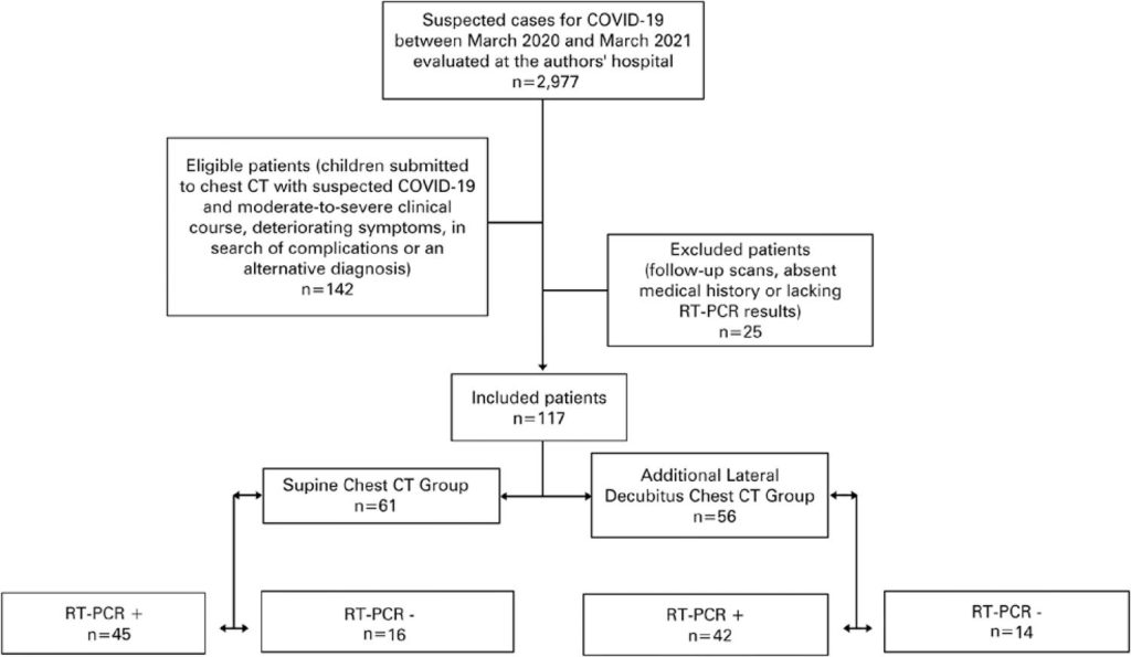 To compare inter-rater reliability, diagnostic accuracy, and extension of pulmonary involvement in children with suspected COVID-19 submitted to supine or supine and lateral decubitus computed tomography imaging.