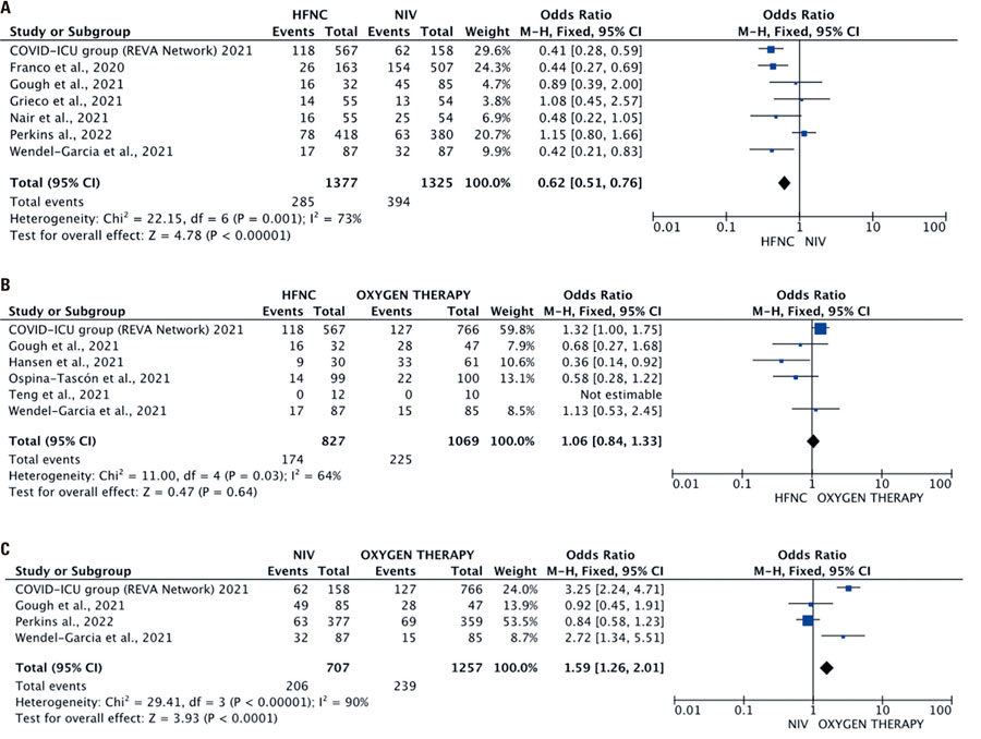 Forty-one studies were included in the review and ten in the meta-analysis (2,843 patients). High-flow nasal cannula therapy did not differ from non-invasive ventilation in terms of the intubation rate (OR=1.07, 95%CI=0.89-1.29, p=0.45) but was superior to oxygen therapy (OR=0.79, 95%CI=0.64-0.97, p=0.02). High-flow nasal cannula therapy was also associated with lower mortality than non-invasive ventilation (OR=0.62, 95%CI=0.51-0.76, p<0.0001) but did not differ from oxygen therapy (OR=1.06, 95%CI=0.84-1.33, p=0.64). Substantial heterogeneity was observed in the subgroup analyses (I2=64%-90%).