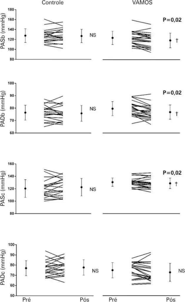 O Grupo Vida Ativa Melhorando a Saúde reduziu a pressão arterial sistólica braquial (de 131,3±15,8mmHg a 125,1±17,3mmHg; p<0,01) e central (de 123,6±16,3mmHg a 119,0±20,6mmHg; p=0,02) e a pressão arterial diastólica braquial (123,6±16,3mmHg a 119,0±20,6mmHg; p<0,01) e apresentou melhora na hiperemia reativa pós-oclusão (de 5,7±2,5mL·100mL−1a 6,5±2,1mL·100mL−1tecido·min−1; p=0,04). Não houve modificação na composição corporal, na frequência cardíaca e nem nos parâmetros de rigidez arterial em ambos os grupos (p>0,05).