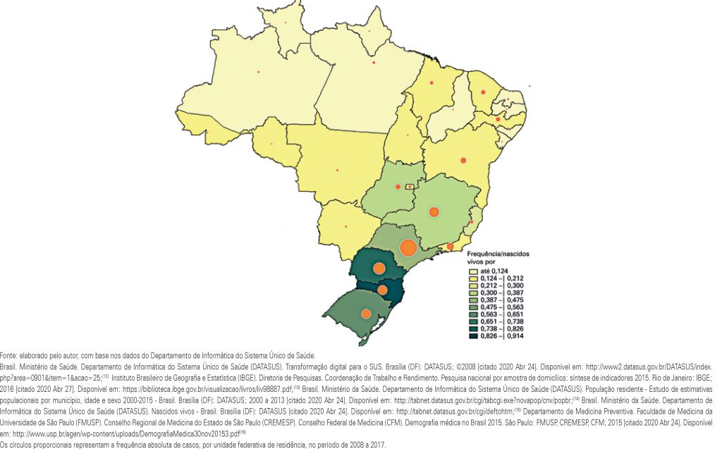 No período, foram internados 14.584 pacientes com displasia segundo o Departamento de Informática do Sistema Único de Saúde. Os pacientes receberam tratamento hospitalar específico para displasia em 8.592 casos (custo médio de R$ 2.225,50 por internação), com custo de R$ 19.124.086,25 (valores atualizados). Nesse grupo, o tempo médio de internação foi de 4,41 dias (desvio-padrão de 2,39 dias) e a mortalidade foi de 0,046%. Idade de 1 a 4 anos (37,7%), sexo feminino (64,5%) e raça branca (46%) foram as mais frequentes. Maiores taxas de especialistas (R²=0,82; p<0,001), maior proporção de municípios com desenvolvimento humano alto/muito alto (R²=0,79; p<0,001) e maior renda per capita (R²=0,68; p<0,001) foram relacionadas a maiores taxas de tratamentos realizados por mil nascidos vivos (por estado do tratamento). O fator mais relacionado à taxa de tratamentos realizados por mil nascidos vivos (conforme o estado de residência) foi a raça branca (R²=0,90; p<0,001). Estados do Sul tiveram as maiores taxas de tratamentos (por estado de residência, com taxa de 0,73/1.000), e os do Sudeste a maior frequência absoluta de casos (46,7%) e o maior influxo de pacientes.