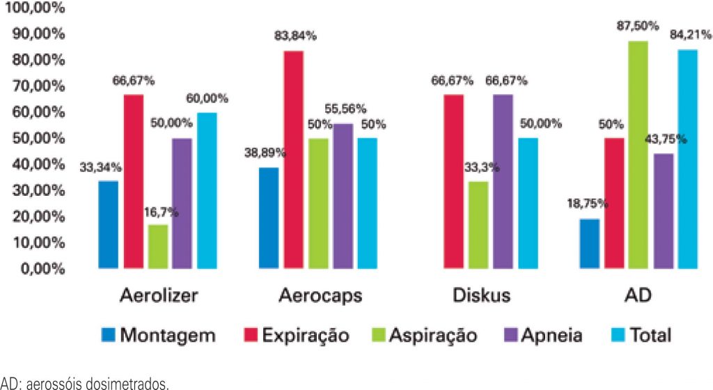 Os erros foram mais frequentes entre os que usavam aerossóis dosimetrados em comparação com dispositivos de pó seco. Os equívocos foram mais comuns na etapa da expiração entre os usuários de dispositivos de pó seco e na aspiração entre os que usavam aerossóis dosimetrados.