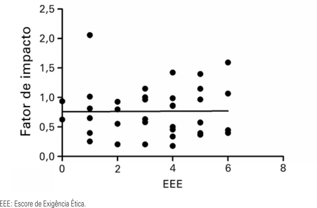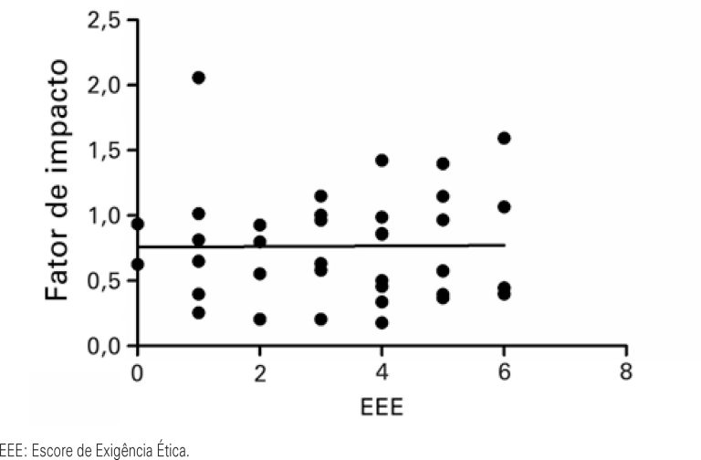 Ainda que o Fator de Impacto das revistas estrangeiras tenha sido consideravelmente maior do que o das nacionais, os resultados mostraram que o Fator de Impacto não apresentou resultado significativo em relação ao escore proposto, o que permite afirmar que a exigência ética para publicação não está relacionada com a abrangência e nem com alcance do periódico.