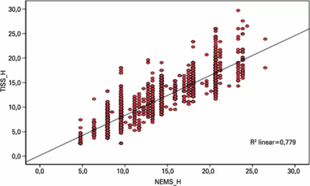 O tempo despendido nas atividades de enfermagem e o dimensionamento da equipe refletido pelo NEMS foram significativamente maiores quando comparados ao TISS-28.