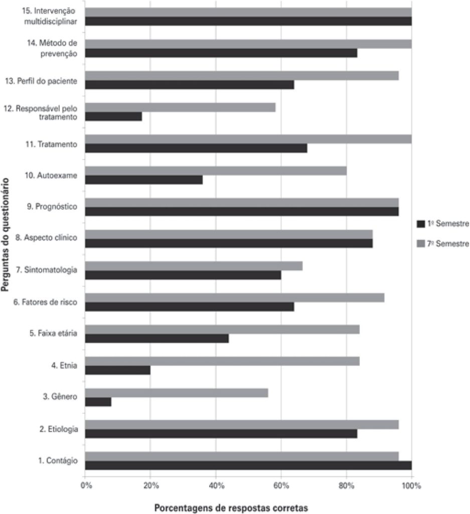 Somente 8,0% do Grupo A e 56,0% do Grupo B julgaram o sexo masculino como aquele frequentemente acometido pela lesão (p=0,0006). Em relação à faixa etária, 84,0% do Grupo B e 44,0% do Grupo A estimaram que a maioria dos casos era diagnosticada acima dos 40 anos (p=0,0072). O tabagismo foi apontado como principal fator de risco por 64,0% e 91,6% dos alunos dos Grupos A e B, respectivamente (p=0,0110). Nas questões referentes a sexo, etnia, faixa etária, fatores de risco, autoexame, tratamento, profissional responsável pelo tratamento e perfil de um indivíduo portador da lesão, os alunos do sétimo semestre apresentaram percentagens de respostas corretas significantemente maiores que as dos discentes do primeiro semestre.