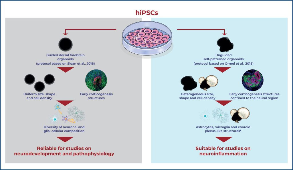 These findings emphasize the importance of selecting neural organoids protocols based on specific research questions, and suggest that the guided and unguided approaches can complement each other to provide insights into neurodevelopmental and neuroinflammatory processes.
