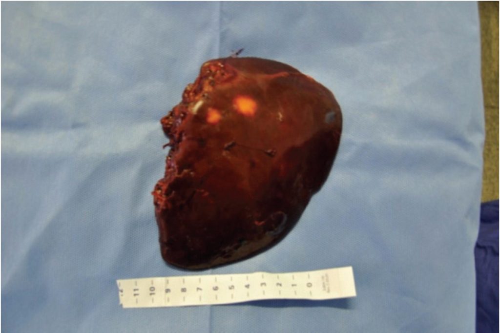 Seis hepatectomias maiores e 12 hepatectomias menores foram realizadas. O tempo cirúrgico médio foi de 205 minutos (variação de 90 a 360 minutos). A média de sangramento intraoperatório foi de 300 mL (variação de 100 a 1.500 mL). Dois pacientes foram transfundidos. Houve uma conversão para cirurgia aberta. Não houve óbitos e nenhum paciente foi reoperado. A morbidade pós-operatória foi de 11% (n = 2). Um indivíduo apresentou uma complicação menor (pneumonia lobar), e outro teve duas complicações maiores (sangramento intraoperatório e hérnia incisional). A duração mediana de internação foi de 4 dias (variação de 2 a 11 dias). O tempo mediano de retorno às atividades diárias foi de 13 dias (variação de 7 a 40 dias).