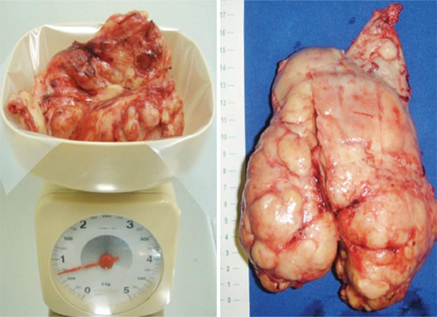 Adenoma prostático, removido com peça única, medindo 17,0x16,0x13,5cm e pesando 720g