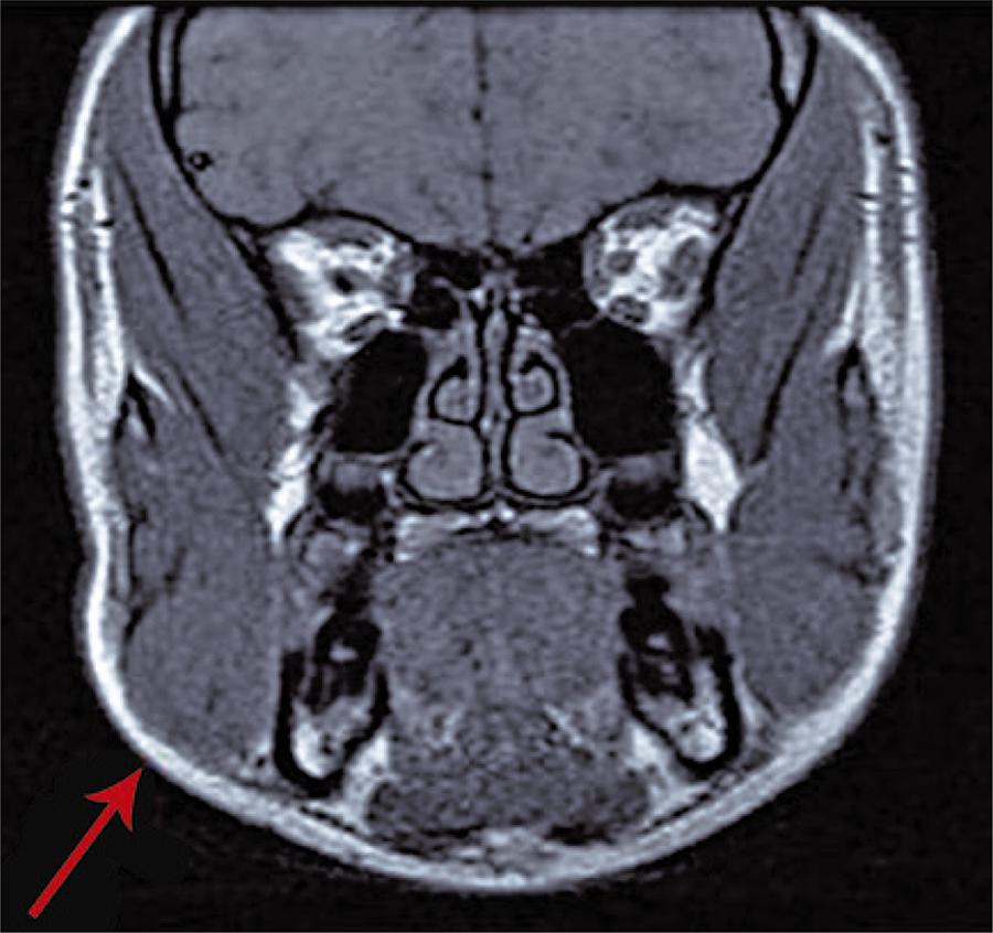 Apresenta-se o caso de uma adolescente, 15 anos, sexo feminino, com antecedentes pessoais irrelevantes, observada no Serviço de Urgência por tumefação mandibular direita, indolor, com 3 meses de evolução e agravamento progressivo. Sem história prévia de traumatismo facial, trismus, sintomas constitucionais ou doença periodontal. À observação (), apresentava assimetria facial, com tumefação no ângulo mandibular direito, mais evidente com oclusão mandibular, palpando-se massa de 4cm de maior eixo, indolor, consistência elástica, com área sobreposta de maior consistência, de 2cm de diâmetro e aderente ao osso. Avaliação analítica sem alterações, com parâmetros inflamatórios e serologias virais negativas. Sem alterações detectáveis em ecografia das glândulas salivares, tendo realizado ressonância magnética da face () que demonstrava assimetria facial envolvendo o músculo masseter e glândula parótida direitos, sem patologia intrínseca, consistente com hipertrofia do masseter. A adolescente foi encaminhada para consulta de cirurgia pediátrica, para eventual cirurgia estética.
