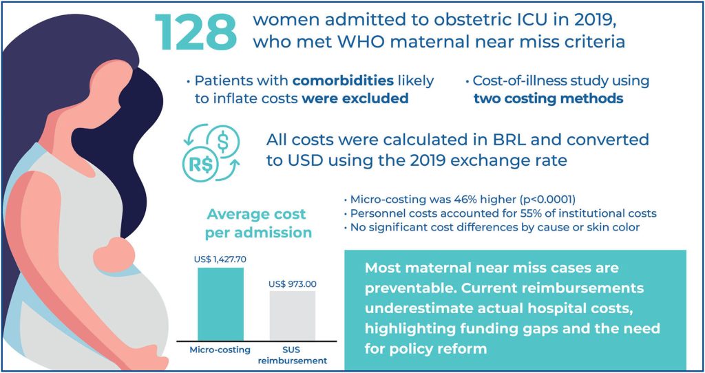 This cost-of-illness study used primary data collected from 128 patients admitted to the obstetric intensive care unit of a reference hospital in 2019 who met the maternal near-miss criteria. Two costing methods were used: micro-costing assessment through reviewing medical records and micro-costing assessment derived from reimbursement data of the Brazilian Public Health System. The resources used were assigned costs in reais (R$) that were converted into US dollars (US$) based on 2019 values.