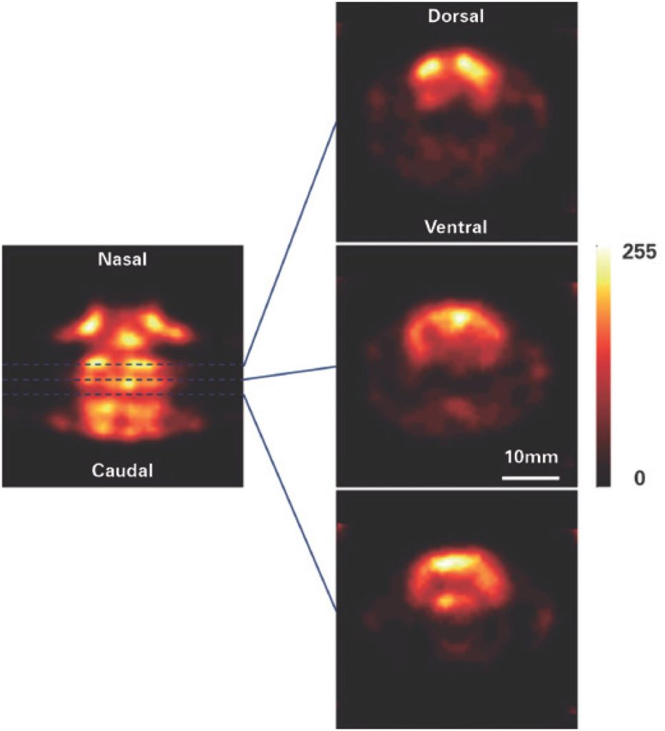 Foram obtidas imagens com resolução espacial de até 0,5mm, com tempos de registro e reconstrução de 30 a 45 minutos, utilizando reconstrução iterativa com 10 a 20 iterações e 4 subconjuntos de projeções. O sistema foi validado obtendo imagens tomográficas in vivo do coração, dos rins e do cérebro de animais normais (camundongos e ratos adultos), utilizando os radiofármacos hexaquis-2-metoxi-isobutil-isonitrila marcado com 99mTc (Sestamibi-99mTc), ácido dimercaptosuccínico marcado com 99mTc (DMSA-99mTc) e hexametil-propileno-amina-oxima marcada com 99mTc (HMPAO-99mTc).