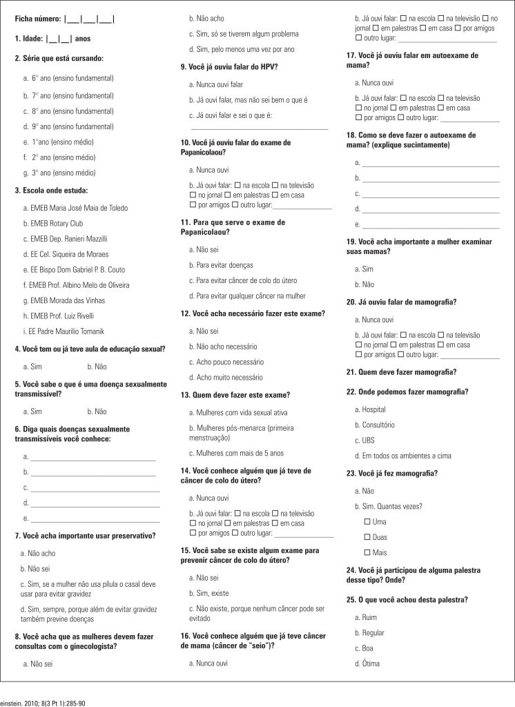 Foi realizado estudo prospectivo de corte transversal para avaliar o conhecimento de um determinado grupo de adolescentes sobre DSTs e câncer do colo uterino, por meio de um questionário aplicado antes e logo após a realização de palestra educativa.