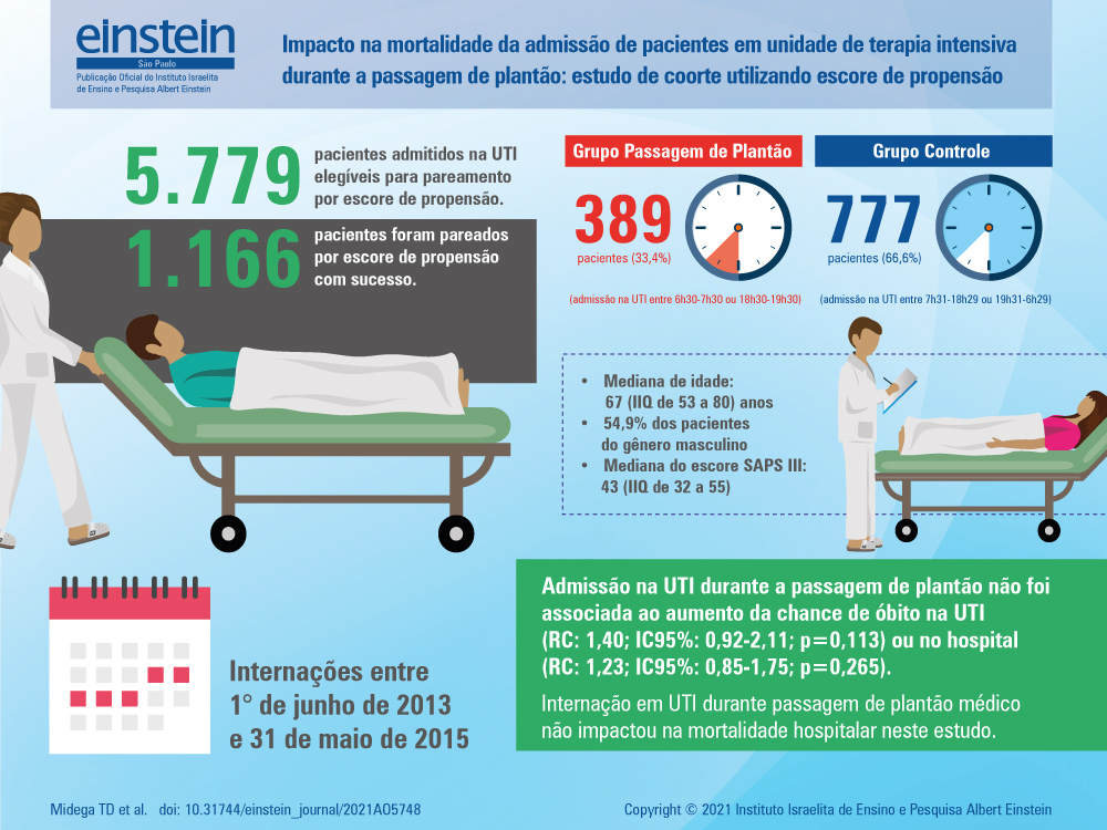 Entre 1° de junho de 2013 e 31 de maio de 2015, 6.650 pacientes adultos foram admitidos na unidade de terapia intensiva. Após a exclusão de participantes inelegíveis, 5.779 pacientes (389; 6,7% no Grupo de Admissão na Passagem de Plantão e 5.390; 93,3% no Grupo de Controle) foram elegíveis para pareamento por escore de propensão, dos quais 1.166 foram pareados com sucesso (389; 33,4% no Grupo Passagem de Plantão e 777; 66,6% no Grupo Controle). Após pareamento, admissão na unidade de terapia intensiva durante a passagem plantão não foi associada ao aumento da chance de óbito na unidade de terapia intensiva (RC: 1,40; IC95%: 0,92-2,11; p=0,113) ou no hospital (RC: 1,23; IC95%: 0,85-1,75; p=0,265).