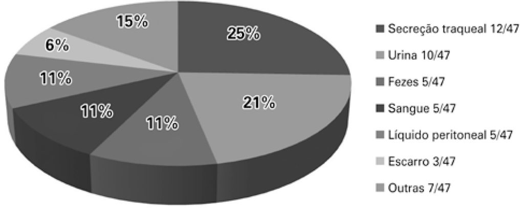 Foram incluídos 47 pacientes isolados, todos apresentando resistência aos carbapenêmicos, dos quais 9 tiveram confirmação de infecção/colonização por K. pneumoniae carbapenemase. Ocorreu predomínio de isolamento em aspirados traqueais (12; 25,5%). A resistência ao ertapenem, meropenem e imipenem foi de 91,5%, 83,0% e 80,0%, respectivamente. Os aminoglicosídeos foram a classe de antimicrobianos que apresentou maior sensibilidade, sendo 91,5% sensível a amicacina e 57,4% a gentamicina.