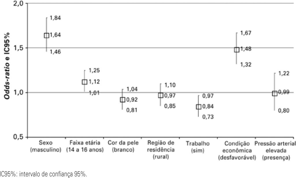No presente estudo, 56,8% responderam não ter medido a pressão arterial nos últimos 12 meses. O posto de saúde e a consulta médica foram os lugares mais mencionados (28,3% e 36,9%, respectivamente) em que foi realizada a medida da pressão arterial. Ser do sexo masculino (odds ratio de 1,64; IC95%: 1,46-1,84), ter idade entre 14 e 16 anos (odds ratio de 1,12; IC95%:1,01-1,25) e apresentar situação econômica desfavorável (odds ratio de 1,48; IC95%: 1,32-1,67) foram associados positivamente a não medição da pressão arterial. Trabalhar foi fator de proteção para não medição da pressão arterial (odds ratio de 0,84; IC95%: 0,73-0,97).