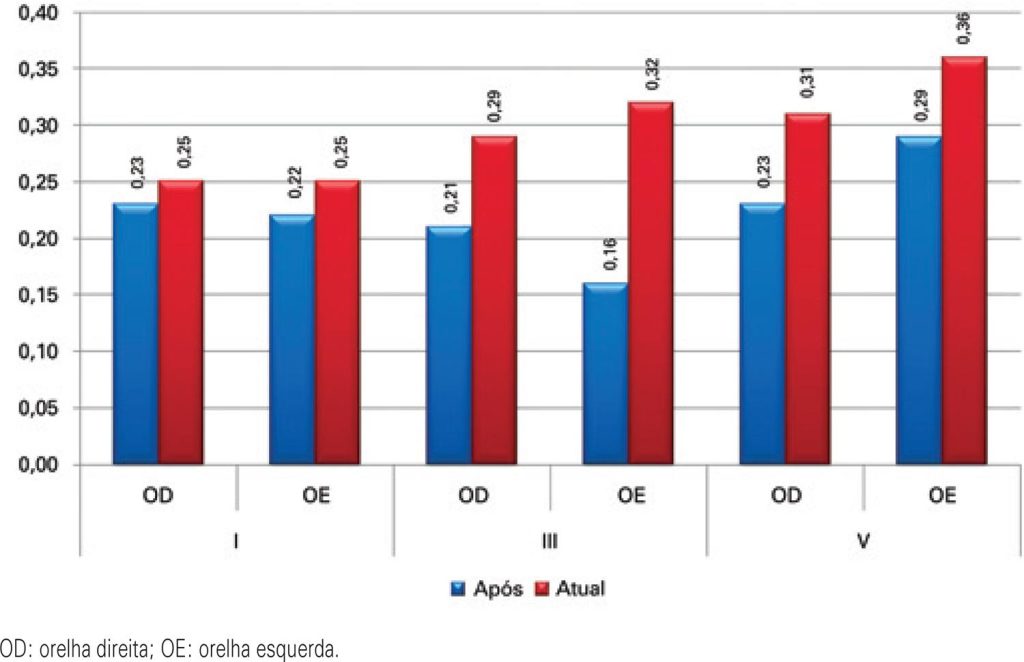 Quanto ao potencial de tronco encefálico, observou-se aumento da latência absoluta de todas as ondas e os intervalos interpicos, na comparação entre as avaliações, bilateralmente, bem como aumento da amplitude de todas as ondas, sendo a onda V estatisticamente significativa, para a orelha direita e a onda III para a orelha esquerda. Quanto ao P3, observaram-se diminuição da latência e aumento da amplitude do P3 na avaliação atual em ambas as orelhas. A avaliação comportamental atual evidenciou desempenho semelhante nas duas avaliações, exceto no teste dicótico de dissílabos alternados na orelha esquerda e a quantidade de erros no teste dicótico consoante-vogal.