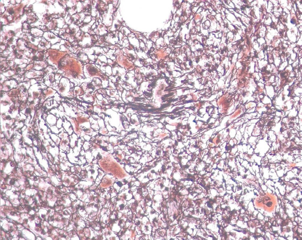 Mielofibrose acentuada, evidenciada por coloração específica (impregnação pela prata), mostrando megariócitos distorcidos de permeio a traves espessadas de reticulina