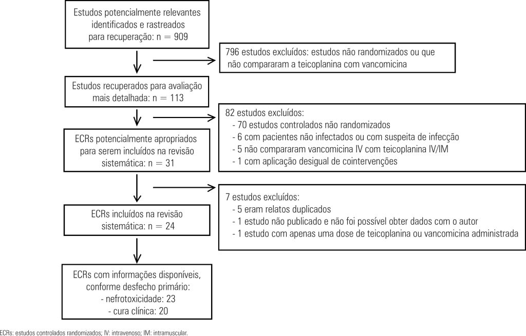 Foram incluídos 24 estudos (2.610 pacientes). As drogas tiveram taxas semelhantes de cura clínica (RR: 1,03; IC95%: 0,98-1,08), cura microbiológica (RR: 0,98; IC95%: 0,93-1,03) e mortalidade (RR: 1,02; IC95%: 0,79-1,30). A teicoplanina apresentou menores incidências de rash cutâneo (RR: 0,57; IC95%: 0,35-0,92), síndrome do homem vermelho (RR: 0,21; IC95%: 0,08-0,59) e eventos adversos em geral (RR: 0,73; IC95%: 0,53-1,00). A teicoplanina reduziu o risco de nefrotoxicidade (RR: 0,66; IC95%: 0,48-0,90). Esse efeito foi consistente em todos os subgrupos, inclusive aqueles com pacientes recebendo aminoglicosídeos concomitantes (RR: 0,51; IC95%: 0,300,88) ou com dosagens de vancomicina corrigidas pelo nível sérico (RR: 0,22; IC95%: 0,10-0,52). Não foi encontrado nenhum caso de injúria renal que necessitasse de diálise.