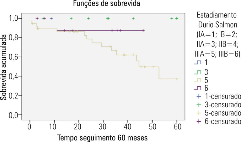 A mediana de idade foi de 58,5 anos. A anemia foi observada ao diagnóstico de 87% dos pacientes, hipercalcemia em 38% e níveis de creatinina superior a 2 mg/dL em 19%. A proteína M foi detectada em 85,7%. A taxa de sobrevida em 5 anos foi de 74,6%. A análise multivariada demonstrou significância estatística para o estadiamento de Durie-Salmon (p = 0,037). O International Staging System e o tipo de imunoglobulina não se correlacionaram significativamente com a sobrevida do grupo.