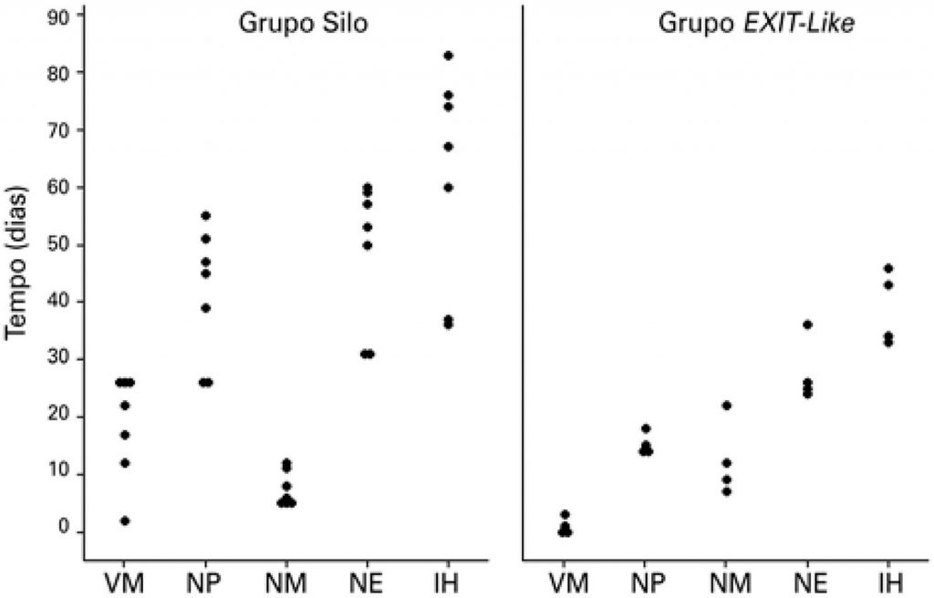 Quatro casos, dos cinco, foram submetidos ao EXIT-like. A correção foi completa em três casos. Os demais casos foram partos a termo planejados, e a correção do defeito foi feita com Silo. O tempo médio de redução da víscera foi de 5,0 minutos no grupo submetido ao procedimento EXITlike, e a oximetria foi mantida dentro dos valores de variação normal em todos os casos. No período perinatal, foram observadas diferenças estatisticamente significativas no tempo de ventilação mecânica (p=0,0169), duração da nutrição parenteral (p = 0,0104) e da nutrição enteral (p=0,0294).