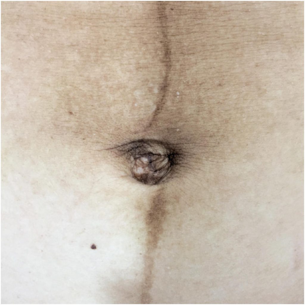 O estudo foi realizado no período de setembro de 2017 a abril de 2018 e incluiu 157 puérperas admitidas para o parto no Serviço de Obstetrícia de uma maternidade pública da cidade de São Paulo (SP). O abdome das pacientes foi fotografado no primeiro ou segundo dia pós-parto, com a paciente deitada simetricamente em decúbito dorsal a uma distância padronizada. O contraste foi ligeiramente ajustado, e o padrão morfológico da linea nigra supra e infraumbilical na proximidade da cicatriz umbilical foi caracterizado. As imagens foram analisadas independentemente por dois pesquisadores, e apenas os resultados concordantes dos dois observadores foram utilizados.