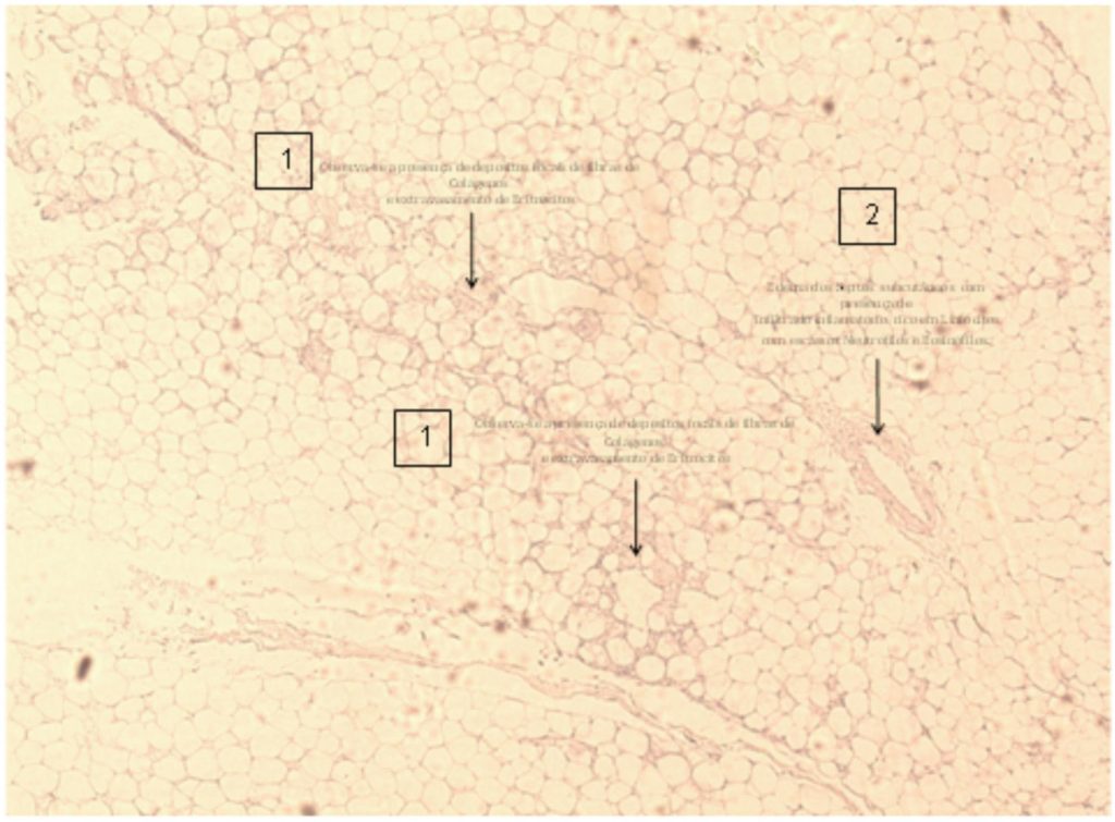 Depósitos focais de colágeno e extravasamento de eritrócitos (1). Edema de septo subcutâneo com infiltrado inflamatório (2)