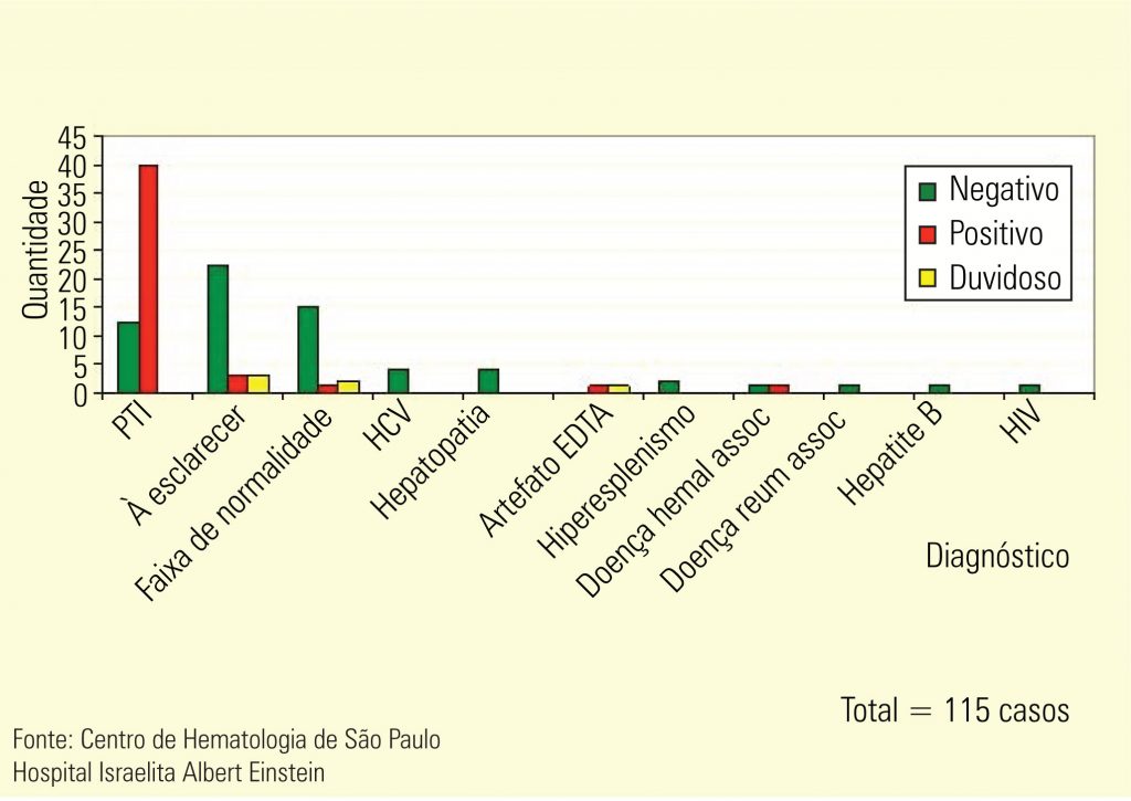 No período de Janeiro de 1997 a Março de 2004, foram encaminhados ao Centro de Hematologia de São Paulo 15.100 pacientes para investigação hematológica, com vários diagnósticos (anemia, leucopenia, plaquetopenia, alteração da coagulação, adenomegalias, leucemia e outros) dos quais 1.057 apresentavam plaquetopenia. Esses pacientes, conforme diagnóstico, foram separados em dois grupos: Grupo Púrpura Trombocitopênica Idiopática, quando não foi descoberta a etiologia da plaquetopenia; e Grupo Outra Trombocitopenia, que incluía faixa de normalidade a esclarecer, infecção pelo vírus da hepatite C, HIV, hiperesplenismo, artefato EDTA, erro laboratorial e outras. Em 115 casos, foi realizada imunofenotipagem, para identificação de anticorpo antiplaquetas (método direto), por citometria de fluxo.