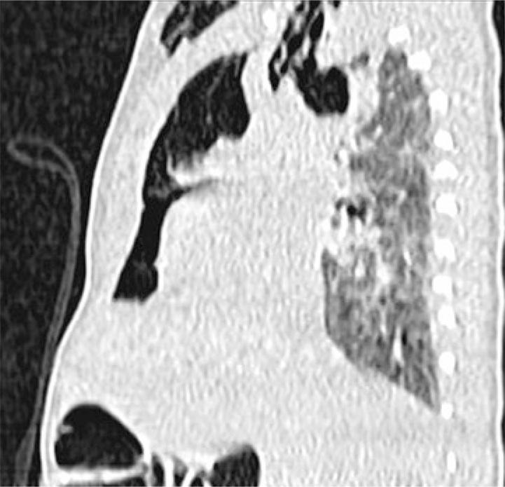 O exame radiológico apresentado pertence a um recém-nascido cuja gravidez foi vigiada e decorreu sem intercorrências. Nasceu por ventosa com 38 semanas, com choro imediato e índice de Apgar 9/10. Foi diagnosticado, no primeiro dia de vida, com enfisema subcutâneo na face anterossuperior do tórax. Efetuou uma radiografia de tórax que mostrou enfisema subcutâneo cervical e sinal de “vela de Spinnaker” (cunha hipotransparente estendendo-se até ao mediastino superior delimitada inferiormente por zona hipertransparente) (). Fez tomografia computorizada, que mostrou enfisema subcutâneo e extenso pneumomediastino, com discreta septação e sem alterações do parênquima pulmonar ( e ). O recém-nascido esteve sempre estável e apresentando boa evolução clínica. Controle radiológico no sétimo dia de vida sem alterações.