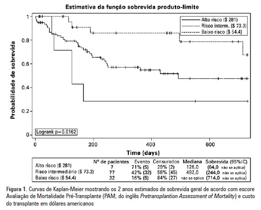 OBJETIVO: Avaliar se o escore de risco Avaliação de Mortalidade Pré-Transplante está associado aos custos de transplante e pode ser usado não apenas para predizer a mortalidade, mas também como ferramenta de gerenciamento de custos. MÉTODOS: Foram avaliados consecutivamente 27 pacientes submetidos a transplante alogênico e 89 a transplante autólogo de células tronco hematopoéticas no período de 2004 a 2006 no Hospital Israelita Albert Einstein (SP). A média de idade dos pacientes por ocasião do transplante foi de 42 anos (variação de 1 a 72 anos); 69 eram do gênero masculino e 47 feminino; 30 pacientes tinham mieloma múltiplo, 41 linfoma não Hodgkin e linfoma de Hodgkin; 22 tinham leucemia aguda; 6 tinham leucemia crônica; e 17 doença não maligna. O escore de risco Avaliação de Mortalidade Pré-Transplante foi aplicado a todos os pacientes usando um web site fornecido pelos autores. RESULTADOS: Classificaram-se os pacientes em três categorias de risco: alto, intermediário e baixo, apresentando diferença significativa de sobrevivência (p = 0,0162). O custo médio, em dólares, foi de U$ 281.000, U$ 73.300 e U$ 54.400 para risco alto, intermediário e baixo, respectivamente. O custo do transplante de células tronco hematopoéticas diferiu significantemente para cada grupo de risco segundo o escore Avaliação de Mortalidade Pré-Transplante (p = 0,008). CONCLUSÃO: A validação do escore de risco Avaliação de Mortalidade Pré-transplante em nossos pacientes confirmou que esse sistema é uma importante ferramenta a ser usada em unidades de transplante, sendo facilmente aplicável e inteiramente reprodutível.