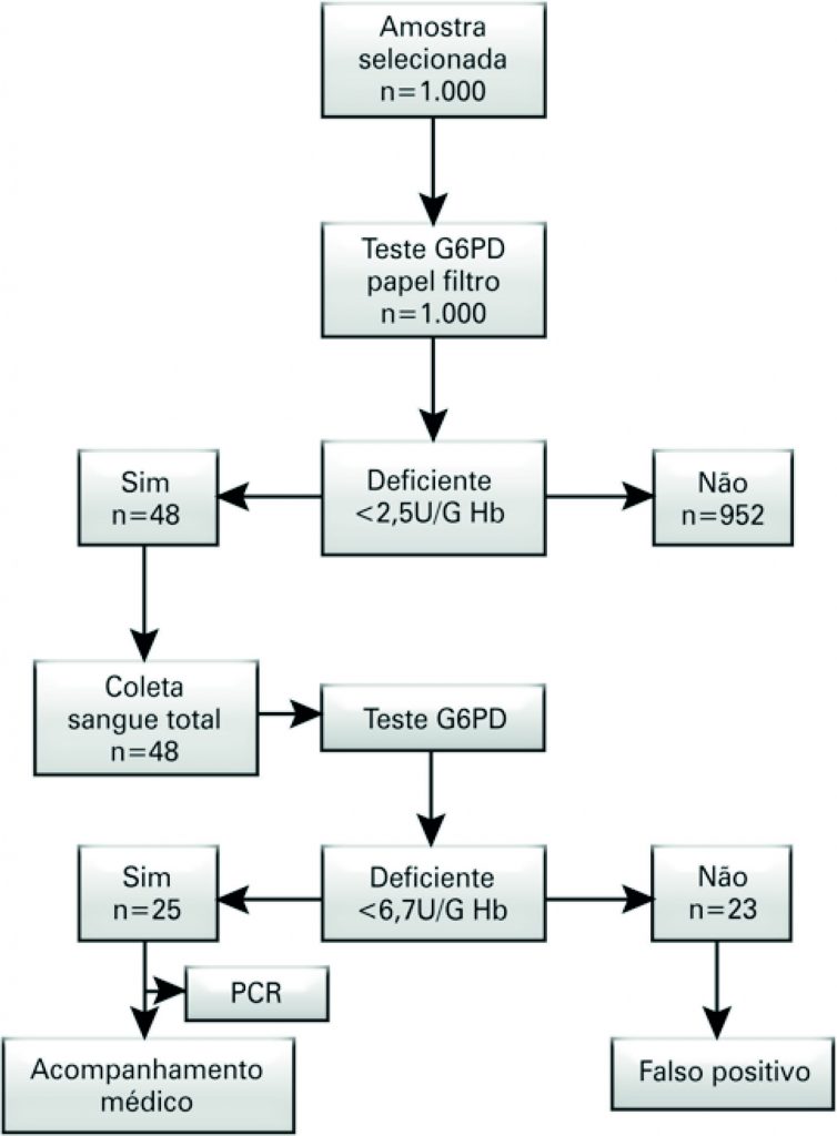 Foram testadas mil amostras por meio da análise quantitativa da atividade enzimática, detectando 25 portadores de deficiência de G6PD. Os pacientes identificados como deficientes foram submetidos à análise molecular reação em cadeia da polimerase em tempo real (qPCR) para pesquisa da presença das variantes associadas à deficiência.