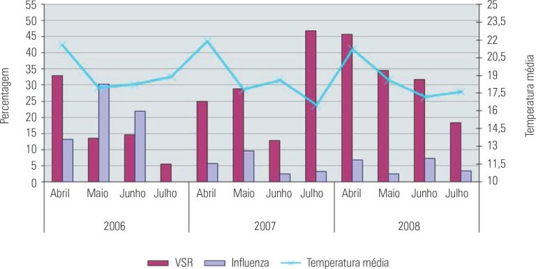 O agente etiológico com maior frequência nas infecções de vias aérea superiores foi o vírus sincicial respiratório, com 29,6% (215/726). Os principais agentes detectados por faixa etária foram: vírus sincicial respiratório em 25,34% (184/726) dos exames de pacientes com faixa etária entre 28 dias a 3 anos; S. pyogenes, com 9,5% (70/740) na fase da infância (3 a 12 anos); vírus influenza, com 8,8% (64/726) detectados na fase adulta (18 a 59 anos).