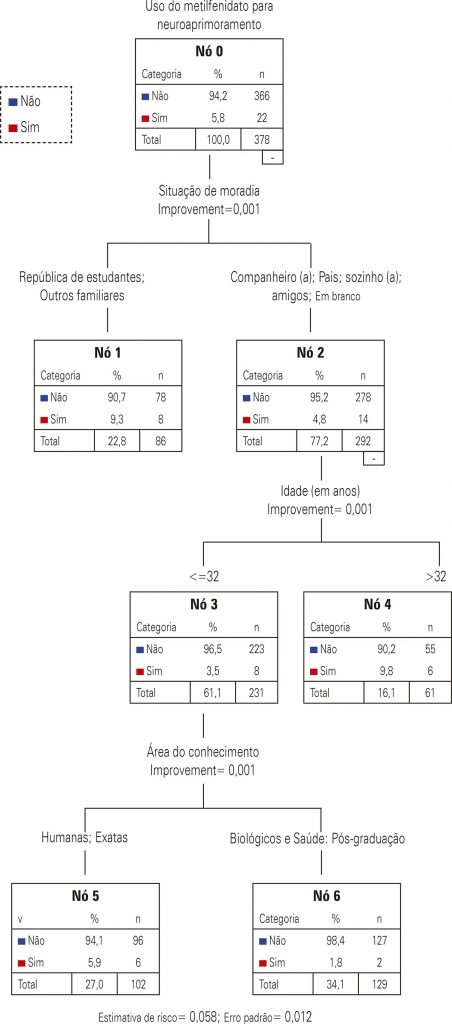 Amostra aleatória simples de discentes da Universidade Federal de Minas Gerais (n=438), convidados a responder um questionário online sobre o consumo de metilfenidato. A coleta ocorreu de setembro de 2014 a janeiro de 2015. A amostra foi descrita em termos de proporções, médias e desvio padrão. A análise multivariada foi realizada utilizando o algoritmo Classification and Regression Tree para classificação dos casos de uso do metilfenidato para neuroaprimoramento em grupos, com base nas variáveis de exposição.