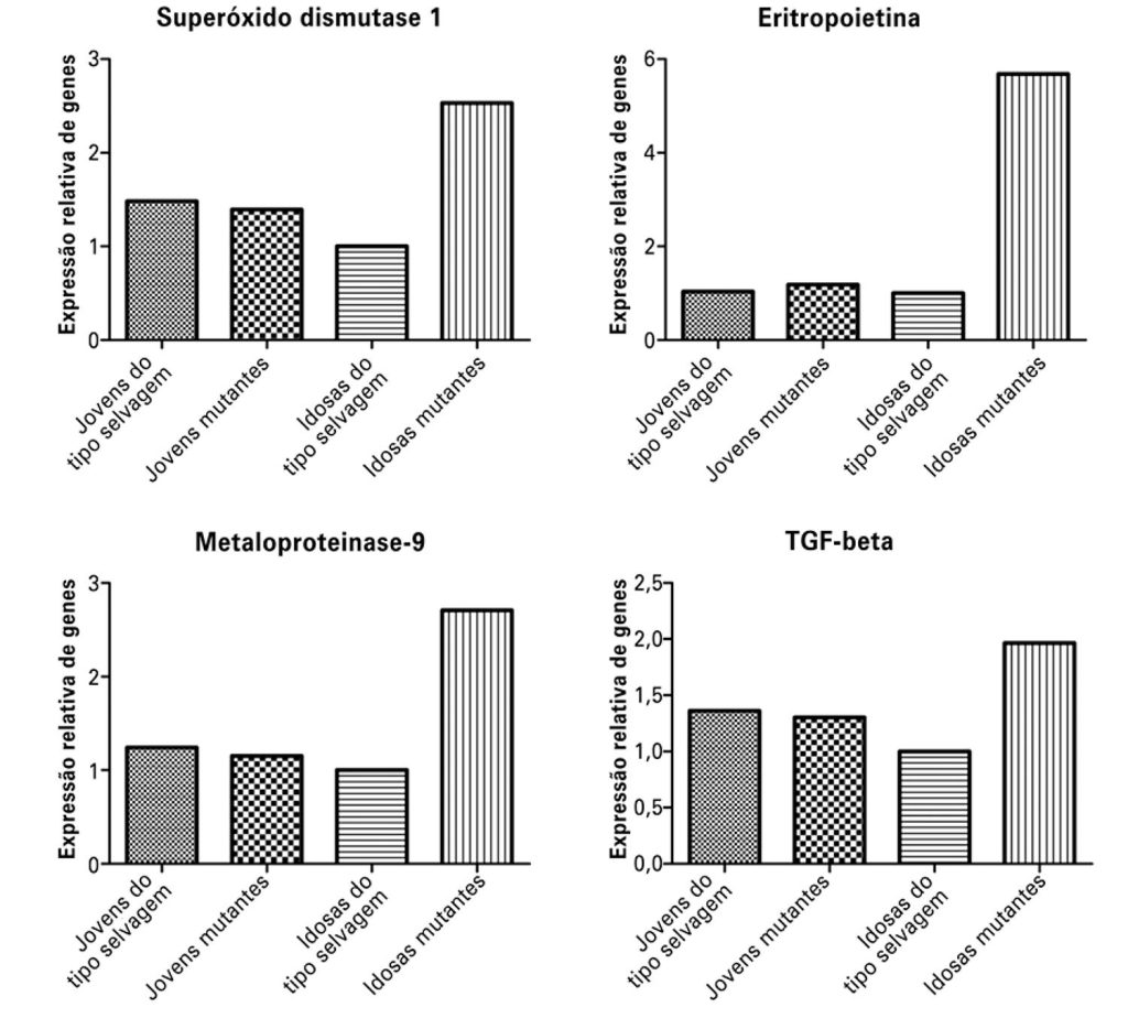 Camundongos mutantes jovens apresentaram glomeruloesclerose em quantidade significativamente maior que animais da mesma idade (p=0,034). Os mutantes mostraram maior formação de cilindros tubulares (p=0,025), deposição de colágeno (p=0,019) e maior expressão de colágeno do tipo IV (p<0,001). A expressão de superóxido dismutase 1 foi maior em mutantes jovens (p=0,038). Mutantes idosas exibiram maior expressão dos marcadores de fibroblastos e macrófagos (p=0,007 e p=0,012, respectivamente). As reações da cadeia de polimerase em tempo real da metalanoproteinase-9 e da eritropoietina estavam aumentadas em 2,5 e 6 vezes, respectivamente, em mutantes idosas. A creatinina sérica foi significantemente maior em animais idosos mutantes (p<0,001).