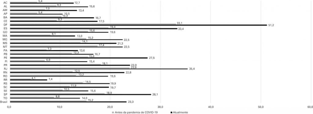 Foi acessado o banco de dados do Cadastro Nacional de Estabelecimentos de Saúde. Os profissionais de saúde que atuavam nos cuidados para COVID-19 foram georreferenciados. O número de profissionais foi correlacionado com os parâmetros utilizados pela Organização Mundial da Saúde. De acordo com a Associação de Medicina Intensiva Brasileira, correlacionaram-se os dados de leitos de terapia intensiva adulta em cada unidade federativa com o número de profissionais para cada dez leitos de terapia intensiva. Os números de profissionais, leitos e casos foram, então, organizados por unidade federativa.