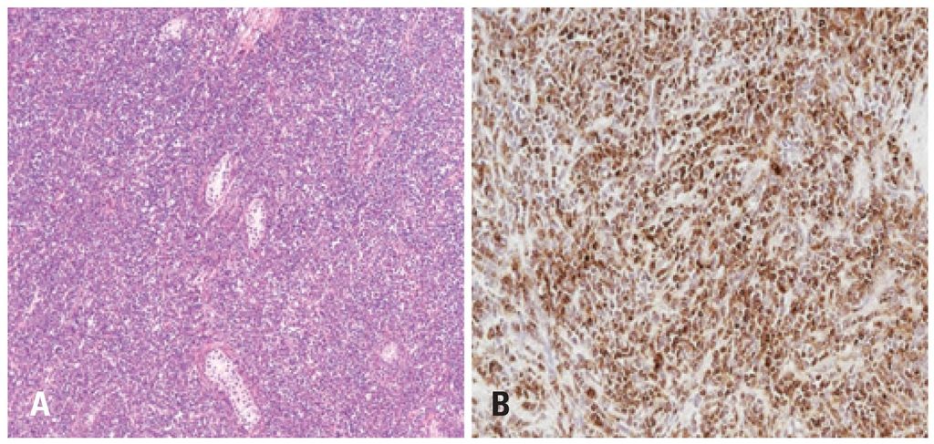 Paciente de 23 anos, masculino, com antecedente de transplante de medula óssea por leucemia mieloide aguda. Há 5 anos, apresentou volumosa massa em região inguinal direita. No exame físico, foi constatada criptorquidia à direita. Os marcadores tumorais alfa-fetoproteína e beta-HCG encontravam-se dentro da normalidade, e a desidrogenase láctica estava aumentada. A tomografia computadorizada de abdomen e pelve revelou massa testicular direita com contiguidade pelo canal inguinal, até o retroperitônio ipsilateral, associada a hidronefrose direita. Devido ao alto risco de neoplasia germinativa em testículo criptorquídico, o paciente foi submetido à orquiectomia radical direita, cujo anatomopatológico revelou recidiva de leucemia mieloide aguda em testículo. Foi encaminhado para oncologia para terapia adjuvante. Nossa revisão não revelou nenhum caso semelhante na literatura.