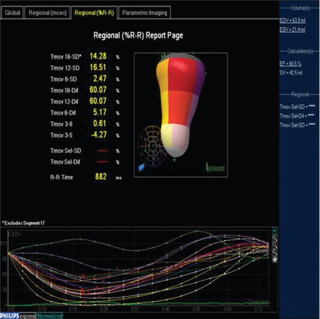 Estudo prospectivo com Eco 3D e 2D de 23 indivíduos (17 homens, 57 ± 13 anos), acometidos por infarto agudo do miocárdio com elevação do segmento ST, primariamente tratados com implante de stent coronariano. Foi feita a dosagem sérica de creatina cinase fração MB, Troponina I, Mioglobina e peptídeo atrial natriurético e comparada com os parâmetros ecocardiográficos (volumes, fração de ejeção do ventrículo esquerdo e índice de dissincronia ventricular). A análise estatística foi feita com a determinação do coeficiente de correlação (Pearson), IC = 95%, p < 0,05, com teste de regressão linear e teste de Bland & Altman.