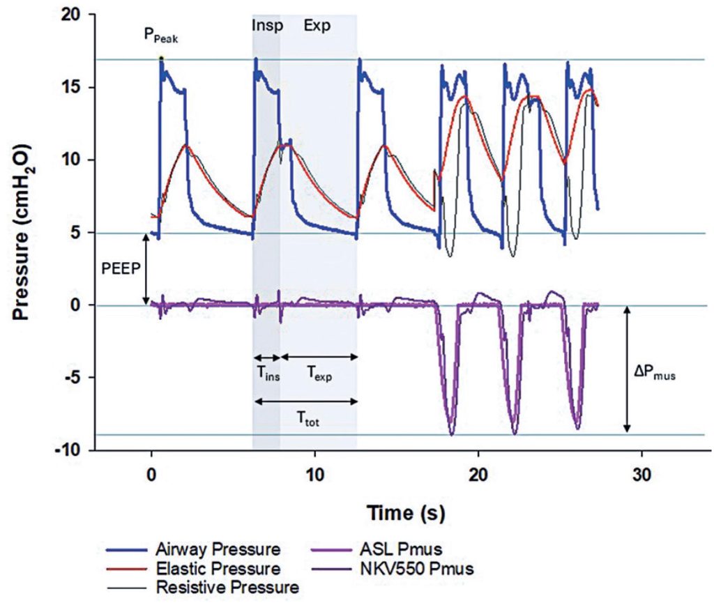 Chart representing the muscle pressure and the airway, elastic, and resistive pressures
