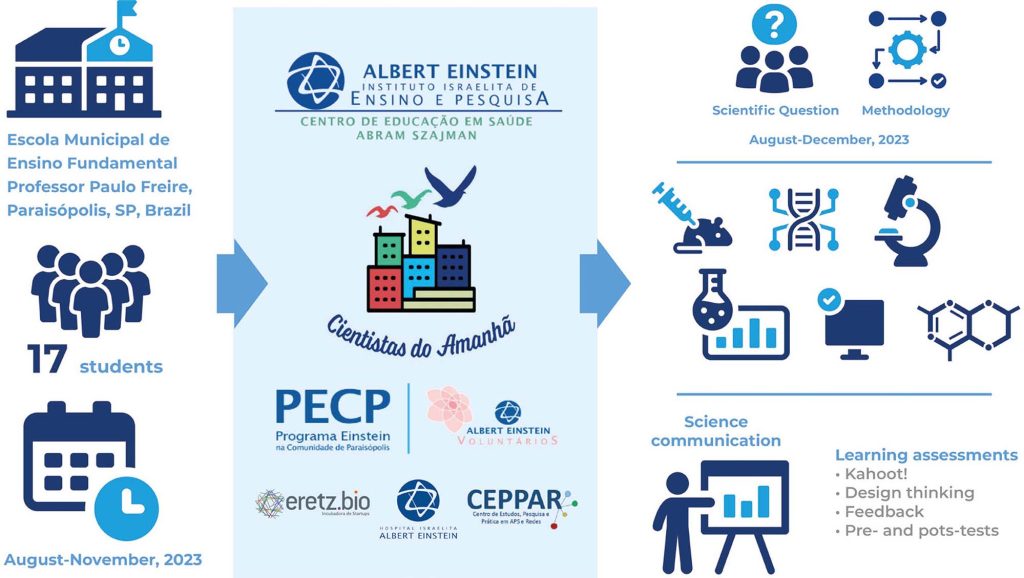 The Scientists of Tomorrow project is a partnership between the Postgraduate Program and multidisciplinary teams of the Hospital Israelita Albert Einstein and Escola Municipal de Ensino Fundamental Professor Paulo Freire of Paraisópolis in São Paulo, Brazil. To inspire 9th-grade students, the project introduced scientific research topics and methodologies to answer questions. This four-month program covered cellular and molecular biology, nanotechnology, bioinformatics, big data, neuroscience, and the impact of nature on well-being and innovation. In the second edition, the program featured 17 students and 35 activities from the beginning of August to the end of November 2023. The program connected with clinical practice, offering students insights into pre-clinical and clinical studies, basic life support training, an overview of the Brazilian Public Health System, and anxiety management techniques such as meditation. Diverse teaching strategies enhanced learning, as evidenced by theory-practical classes, preand post-tests (p<0.05), Kahoot! quizzes, design thinking, and real-time feedback. Students were encouraged to express their ideas verbally and in writing, individually and in groups. On the final day, the students presented their work in poster sessions, where they answered questions, reflected on their research, interacted with other researchers, and developed communication skills. As an innovative and replicable initiative, Scientists of Tomorrow empowers students to apply knowledge effectively, integrating scientific and technological skills with core values. Aligned with the United Nations Sustainable Development Goals (SDGs), especially SDGs 4 (quality education) and 10 (reducing inequalities), this project promoted continuous learning and self-improvement, preparing students to navigate real-life challenges with flexibility, resilience, and creativity.