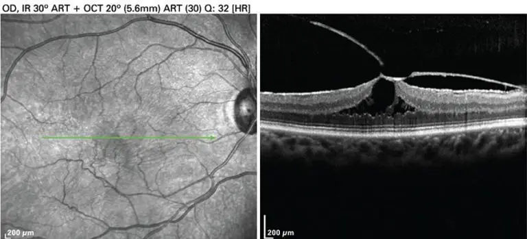 Ao exame, a acuidade visual com melhor correção era de 20/80 em OD e 20/20 em olho esquerdo. À fundoscopia observou-se condensação vítrea na região foveal de OD. Foi realizada tomografia de coerência óptica (OCT, optical cocherence tomography ), que mostrou tração vitreomacular por descolamento parcial de vítreo posterior, desorganizando a estrutura da fóvea e formando aspecto de “corcova de camelo”, associada à presença de membrana de alta refletividade, gerando moderada tração centrípeta da superfície retiniana, com preservação da linha externa e interna dos fotorreceptores ().