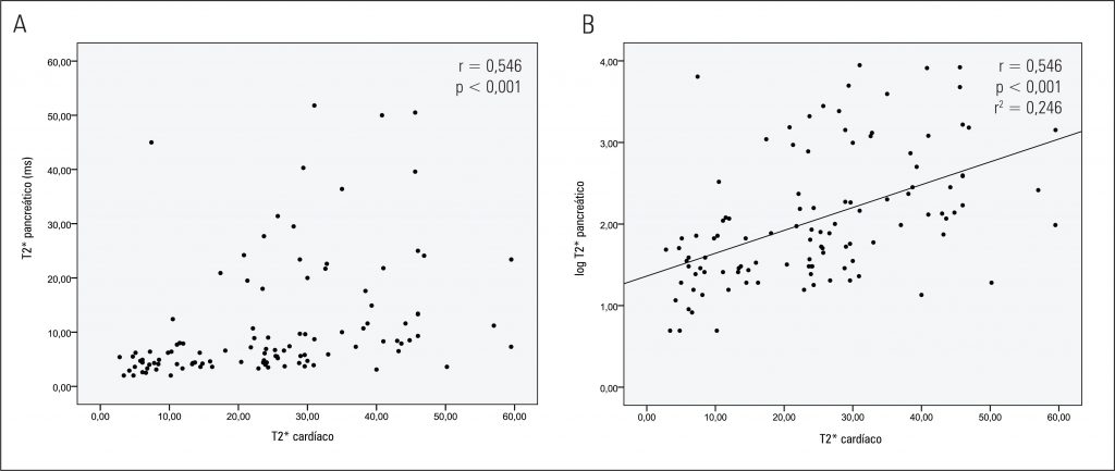 a ferritina sérica média foi de 2.676,5 +/- 2.051,7 ng/mL. O ferro plasmático lábil foi anormal (> 0,6 Unidades/mL) em 48/83 pacientes (57%). A média dos valores de T2* no fígado foi 3,91 ± 3,95 ms, sugerindo siderose hepática em 92,1% pacientes. A média do T2* cardíaco foi de 24,96 ± 14,17 ms e 36% dos pacientes apresentavam siderose cardíaca (T2* < 20ms), dos quais 19% (22/115) já apresentavam sobrecarga cardíaca grave (T2* < 10 ms). A média de T2* no pâncreas foi de 11,12 ± 11,20 ms, perfazendo um total de 83,5% de pacientes com sobrecarga de ferro pancreático (T2* < 21 ms). Houve correlação significativa, curvilínea e inversa entre T2* fígado e a concentração de ferro hepática (r = −0,878; p <0,001) e correlação moderada entre T2* pâncreas e T2* miocárdio (r = 0,546; p <0,0001).