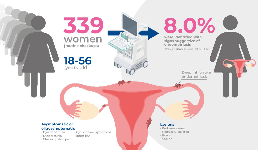 This was a retrospective observational study including women (n=339; aged 18-56 years) referred for transvaginal sonography as part of a routine gynecological evaluation (without clinical suspicion of endometriosis). Patients were asked about their symptoms. In addition, they were systematically checked by an experienced radiologist for sonographic signs of deep infiltrative endometriosis (hypoechoic nodules or tissue thickening, with regular or irregular margins) in the retrocervical area, vaginal fornix, rectosigmoid junction, and bladder, as well as for ovarian endometriomas (cysts with thick walls and hypoechogenic content).