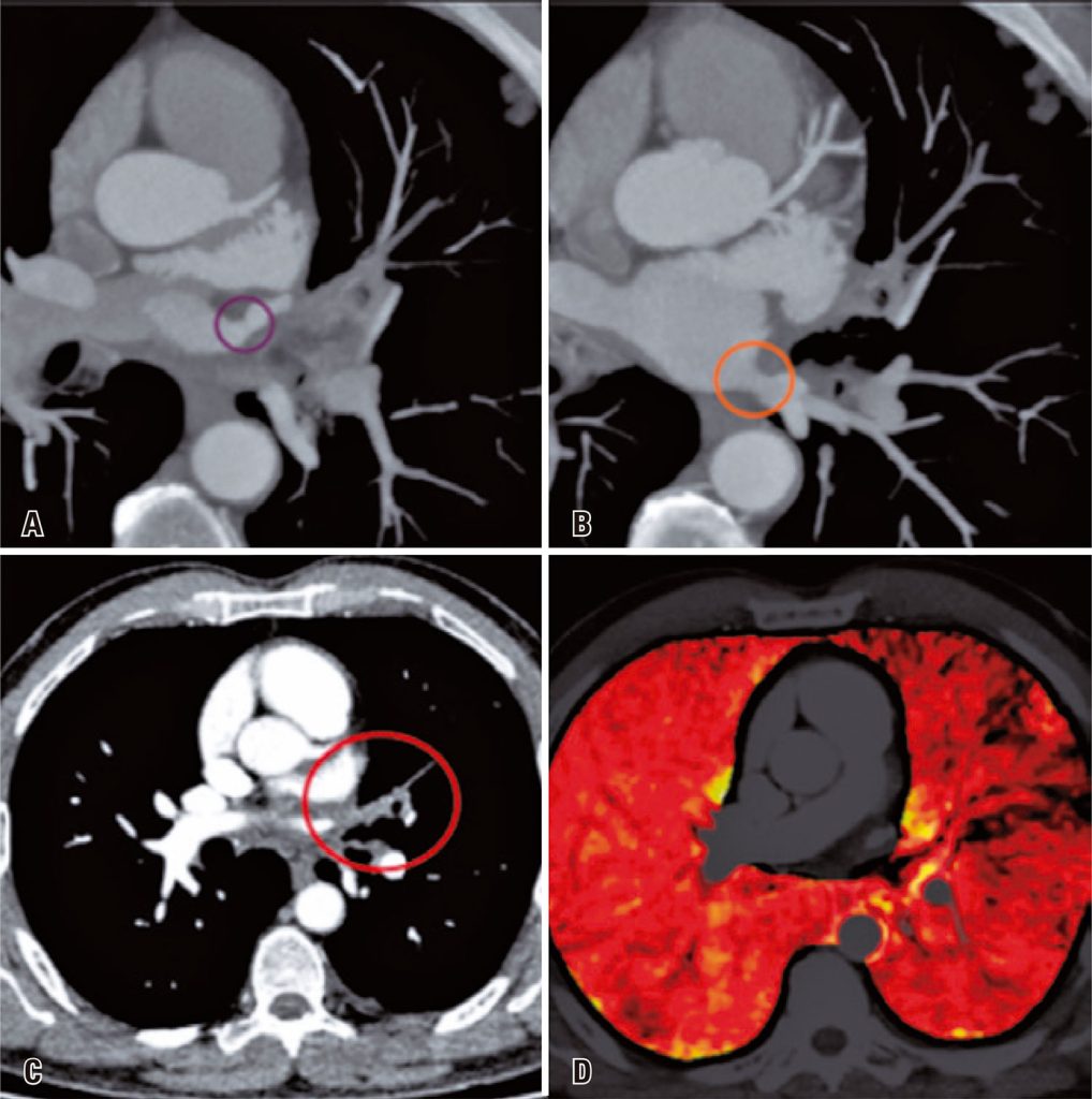 A 55-year-old male patient presented to the emergency department with ventilatory-dependent chest pain, 5 months after undergoing radiofrequency ablation for atrial fibrillation. Upon initial assessment, the patient exhibited an elevated D-dimer level of 1122ng/mL. Consequently, a computed tomography pulmonary angiogram (CTPA) was requested to investigate because of the possibility of a pulmonary thromboembolism. The CTPA ( ) revealed a focal reduction in the caliber of both the left upper and lower pulmonary veins ostia. Additionally, occlusion of the pulmonary venous branches upstream of the stenotic point was observed. The corresponding segmental pulmonary hypoperfusion within the territory drained by the stenosed veins was clearly illustrated in the iodine map images.