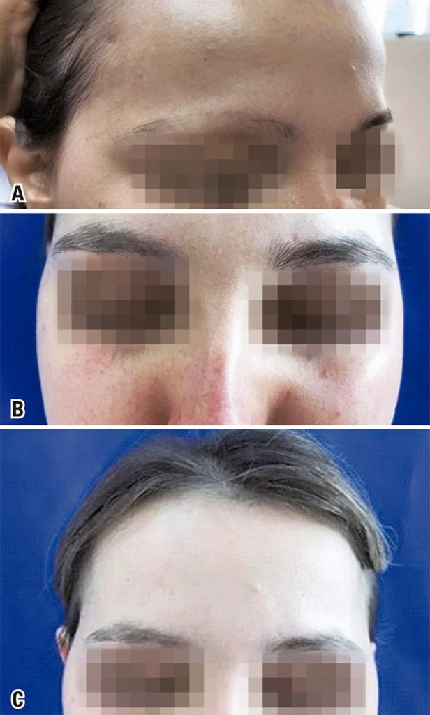 Uma paciente de 23 anos, de cor branca, com historia de 12 anos de alopecia areata apresentou perda difusa de cabelo e segmentos da sobrancelha. Fez uso prévio de corticosteroides orais, ciclosporina, metotrexato, porém sem resposta na sobrancelha direita ( ). Iniciou tofacitinibe tópico 2% (Chemistry Rx Compound and Specialty Pharmacy, Filadélfia, EUA), uma vez por dia e seguimento a cada 4 semanas. Foi possível observar repilação após 4 semanas do início do tratamento ( ) e, após 2 meses, completa repilação da sobrancelha e em outros locais com alopecia. Após 4 meses da suspensão do tratamento, manteve resposta positiva ( ).