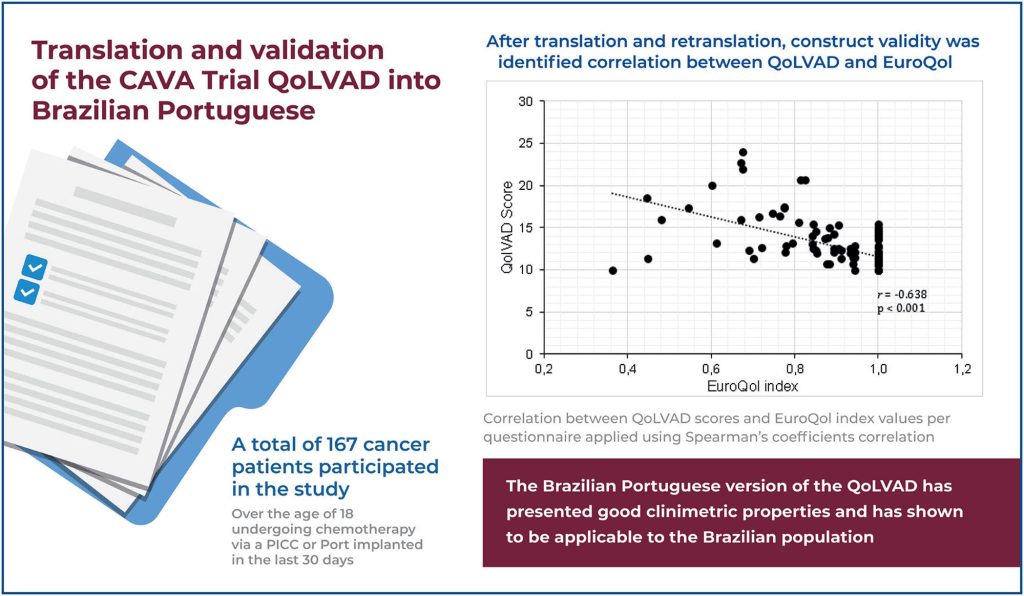 The use of long-term devices for chemotherapy in neoplastic diseases is very common. The CAVA trial was an extensive study that prospectively evaluated more than 1000 patients undergoing chemotherapy and randomly allocated them to three groups based on the type of catheters used: peripherally inserted central catheters, Port, or Hickmann. For this study, the Quality of Life Vascular Access Device (QoLVAD) questionnaire was administered to assess the impact of these devices (abovementioned catheters) on the patients’ daily lives. routine However, no Brazilian Portuguese version of the questionnaire exists, hindering its use among Brazilian patients.