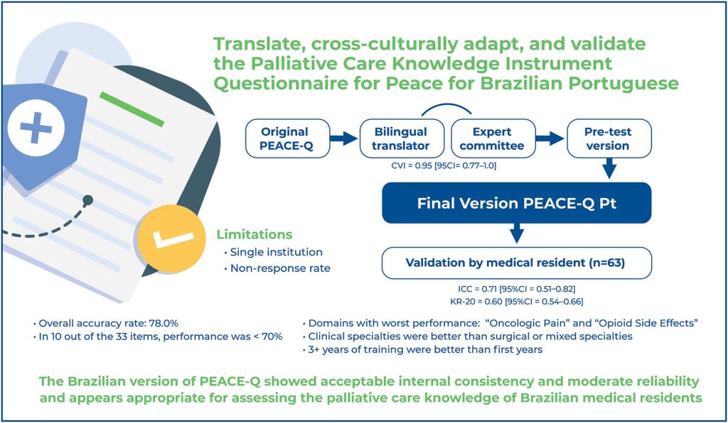 The Brazilian version of the PEACE-Q demonstrated acceptable internal consistency and moderate reliability and appears appropriate for assessing the palliative care knowledge of Brazilian medical residents.